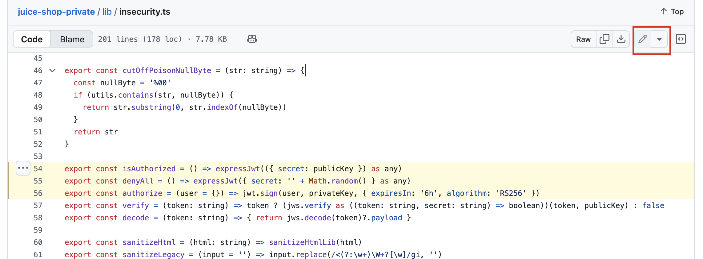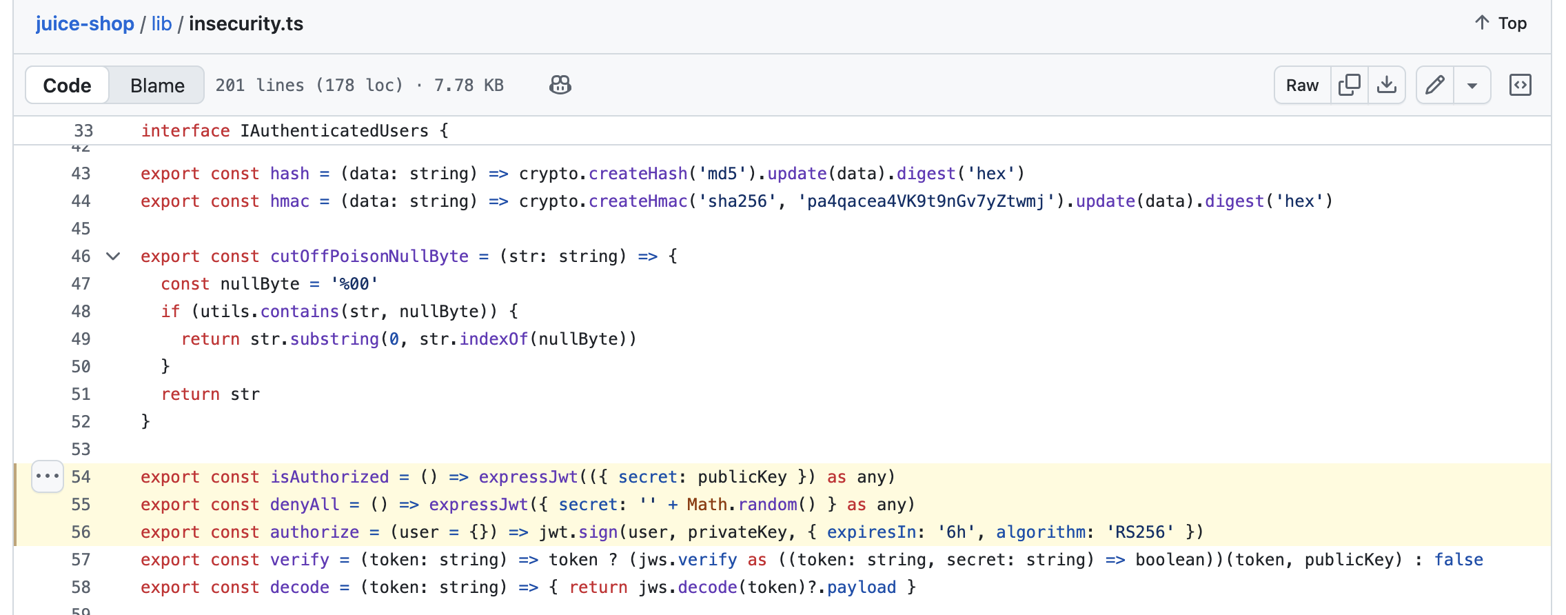 返回到GitHub上的Juice Shop私有分支,并打开命名为lib/insecurity.ts的Typescript文件。滚动到第54行和第56行,找到Juice Shop创建JWT和检查授权的位置。